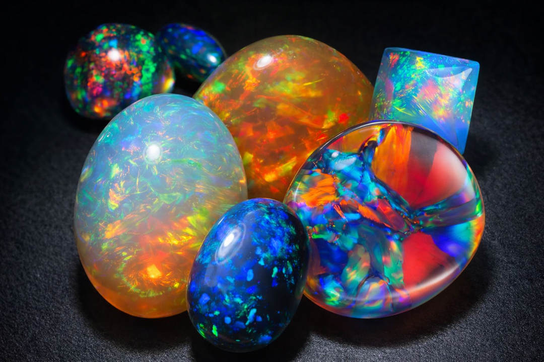 黒や濃紺の地色に鮮やかな遊色が映える希少性の高いオパール。